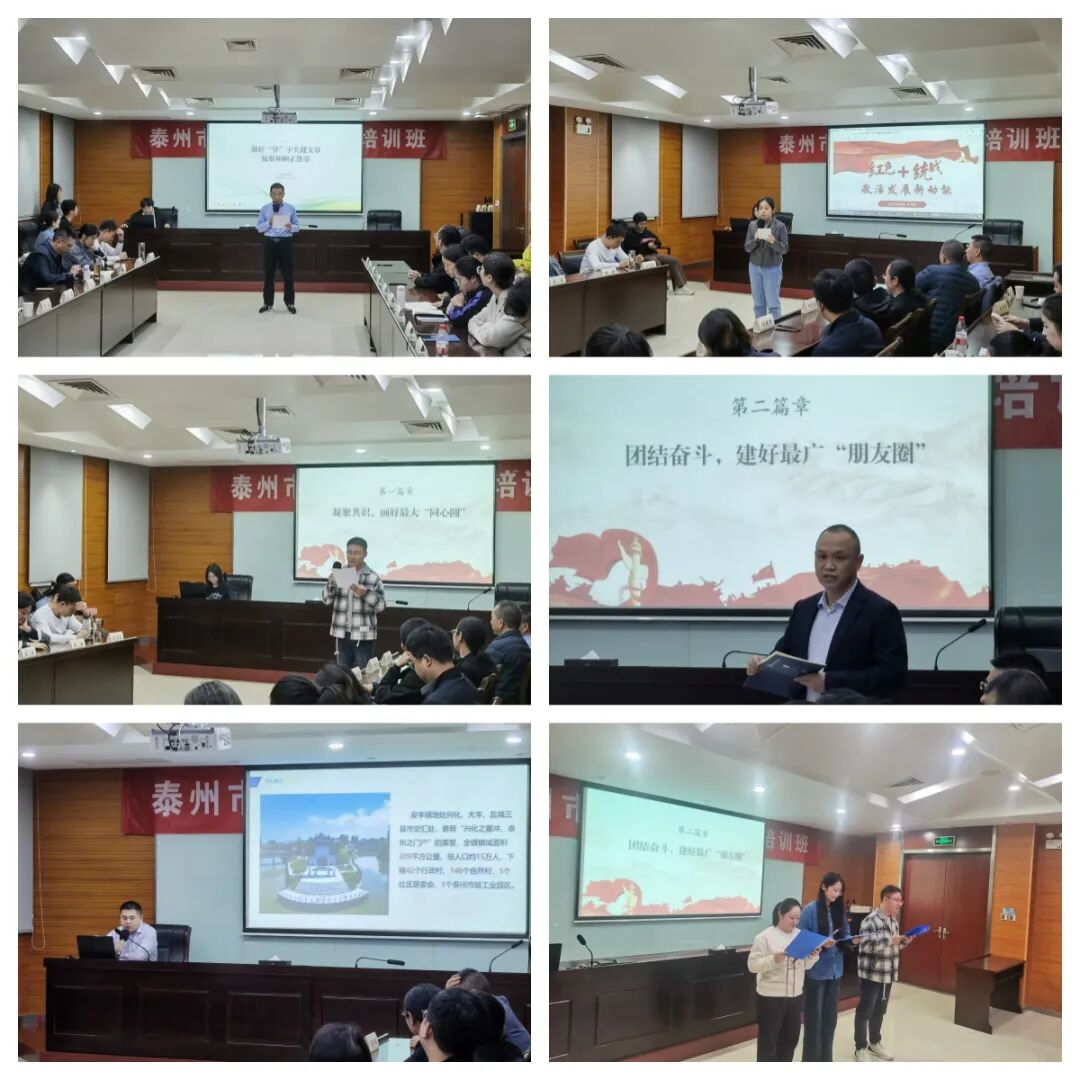 培训期间安排紧凑,每个晚上都有学习活动。组织观看了视频:《淬炼——周恩来的自我革命精神》《居安思?!展餐龅车睦方萄怠に展驳囊馐缎翁ぷ鳌?。围绕“落实统战工作责任制,推动基层统战工作创特色、创品牌、创经验”主题,组织小组讨论。分“凝聚共识,画好最大‘同心圆’;团结奋斗,建好最广‘朋友圈’;发挥作用,当好最强‘助推器’”等三个篇章,紧扣凝共识、聚合力、万紫千红、籽籽同心、同心助力、共同奋斗等关键词,举办学员论坛。通过交流分享、知识问答、节目表演等形式,讲统战故事,谈工作体会。泰兴市宣堡镇党政办杨妍讲述陈毅三进泰州统战故事,靖江市斜桥镇党委统战委员夏银国介绍《做好“导”字大文章 汇聚和顺正能量》规范宗教场所管理的做法,医药高新区永安洲镇党委委员、宣传统战委员缪汶伯交流《同心助力擦亮基层统战“永安洲”名片》工作经验,靖江市靖城街道党工委统战委员黄能用身边的民族团结事例讲述《一碗面的温情》,海陵区委统战部沈凌、周泽璠、蔡晶表演原创小品《海陵来了个新农人》,用文艺的形式展示基层统战工作,赢得大家好评。包国芳副部长点评时,鼓励大家对统战工作要结合实际干、学习借鉴干、带着情怀干,干出新的特色、新的局面、新的成效,为泰州统战工作添砖加瓦、增光添彩。